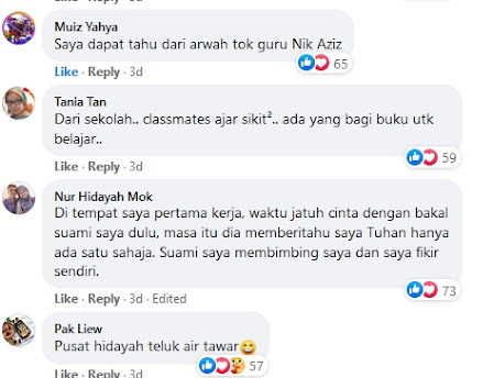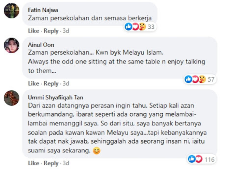 にさあ ぃあおうぇい #1Pengalaman saya dari kecik budak takut dengar azan subuh, bila dengar azan pasti menangis.Saya asal dari kecik sehingga besar takut kepada orang Melayu, tak berani nak bercakap maupun kawan dengan mereka.. bila saya dah dewasa tak takut dengar azan, suka dengar azan suka melihat masjid, hati saya selalu pikir apa orang melayu buat di masjid,Saya berkerja di sebuah kilang yang menjahit baju.. dalam semua ada orang Melayu lebih dari orang cina, orang India, orang asli. Saya cuma berkawan dengan orang cina India asli, kawan kawan melayu, sangat hairan, bila saya dengan orang melayu, macam orang bisu nampak macam takut.seorang makcik Melayu yang mula tegur saya, saya rasa takut, makcik Melayu teruspeluk jangan takut Jenny lim, kita cuma ingin berkawan dengan kamu, setiap kali nampak kamu boleh bercakap senyum bergurau dengan orang cina India asli sangat ceria.tetapi dengan kita kamu langsung tidak mau bercakap.makcik nampak lim macam takut pada kita..peluk makcik tulah yang buat saya berani dan mula berkawan dengan orang melayu..dari situ mereka selalu belanja saya makan, ajak saya ke rumah mereka makan bersama, dari situ saya mula berubah tutup aurat dengan baju kurung, dan mereka lah yang ajak saya ke masjid, mereka pinjamkan baju kurung buat saya, untuk saya masuk ke dalam masjid,hari itu hari malam Khamis, saya tak tahu apa mereka buat,saya cuma tahu depan mereka ada macam macam botol air.Di waktu tu saya tengok tulisan tulisan arab jawi macam tulisan ular, dan buku buku@Al Qur'an..saya sangat tertarik nak tahu apa tulisan dalam buku buku@Al Qur'an, saya ingin nak pegang, kawan kawan melayu terus cakap, lim ini tak boleh pegang, itu adalah Al Qur'an.. selepas hari tu, saya selalu tanya kawan melayu, apa tu Allah apa tu nabi apa tu Al Qur'an, dalam Al Qur'an tulis apa apa tu haji apa tu zakat.saya ingin nak tahu.. kawan kawan melayu suka bergurau dengan saya, aiyoo lim mau masak Islam ke.banyak tanya tentang Islam..Hahaha
