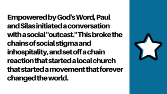 Paul and Silas were evangelizing to a marginalized, disenfranchised group—an act that was considered extreme radical behavior. They realized that when you embrace the power of God’s Word, it tells a story worth sharing, and those who are traditionally oppressed will appreciate the empowerment of the Word the most. Ironically, the church in the 21st century tends to be characterized by who it doesn’t associate with. In contrast, the “church” of two men back in the 1st century was characterized by evangelical radicalism and who it did associate with. Some men have since used the church to oppress, for example, women and people of color. As times change, so does the focus of the oppression, but the basic principle remains constant. Many fail to see the overriding theme woven into the fabric of time and sadly use God’s Word to enforce social stigmas instead of breaking them. The power of God’s Word breaks the chains of social stigmas because such stigmas are temporal and a creation of humankind. God’s Word is eternal and is revealed directly from the divine.