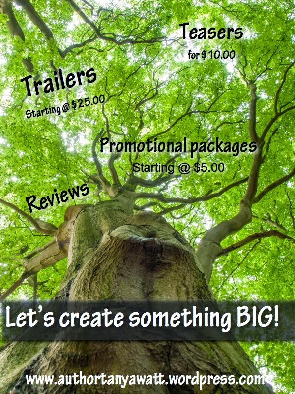 I offer many services on my website, but my favorite is creating trailers. When I'm creating someones trailer, I get very excited! To me it's not only a video, it's away to introduce the readers to a visual image of a story! What can be more exciting that that:) I take great pride in everything I create, and I hope to keep doing this for years to come.