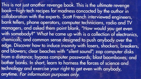See that? Although this is the ultimate revenge book and it's designed to push anybody over the edge, remember: This is for "information purposes only." Don't actually USE any of this stuff, okay? (Via.)