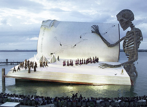 Some of the entertainment at the fest is performed on a floating stage in Lake Constance. Audiences of up to 7,000 can watch operas there, and the sets on the stage are really amazing . . . like the one above! (Telegraph article on the festival here.)