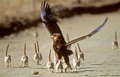 A group of meerkats are peeved that this eagle was sunbathing near their home.
