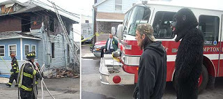 Wayne McGowen, who was sleeping in the basement of the house when it caught fire, watches firefighters at the scene along with neighbor Kali Burns, who was dressed as a gorilla.Wait, that doesn't explain anything! Luckily, I kept reading to the article's end: