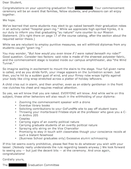 One of my sources shared this amazing letter with me. It's apparently being sent out to graduating seniors at a prominent college in the Pacific Northwest: