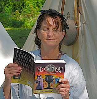 Writer/editor Kathy Anne Barney says she was "moved to laughter, tears and fears" as she devoured The MoonQuest. In the above photo, she sneaks in a few pages during a break from a Civil War reenactment.