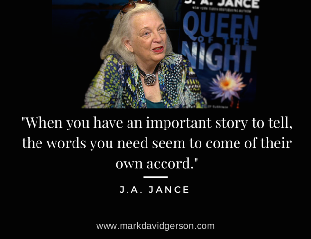 From my interview with J.A. Jance (if the video doesn't play from the player, click here)..."I hated outlining in 10th grade geography class and I hate it now. Because I write murder mysteries, I usually start with somebody dead, and then I spend the rest of the book trying to figure out who did it and how come. I have to sort of step out with faith that if I can write the first sentence of the book, I can eventually, 100,000 words later, get to the end of it."