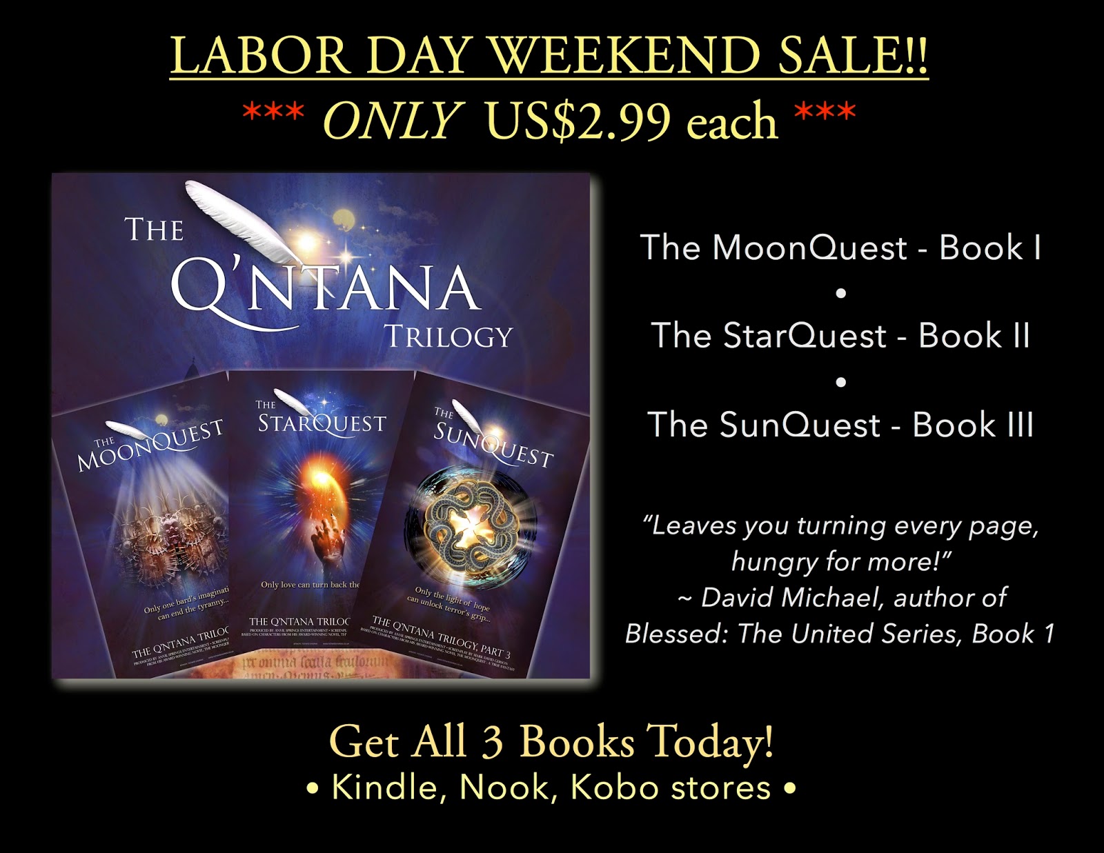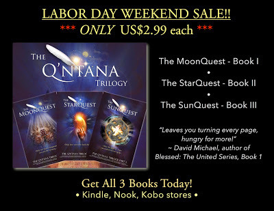 To celebrate the release of The SunQuest, all three Q'ntana Trilogy books are on sale this Labor Day weekend -- for only US$2.99 !!