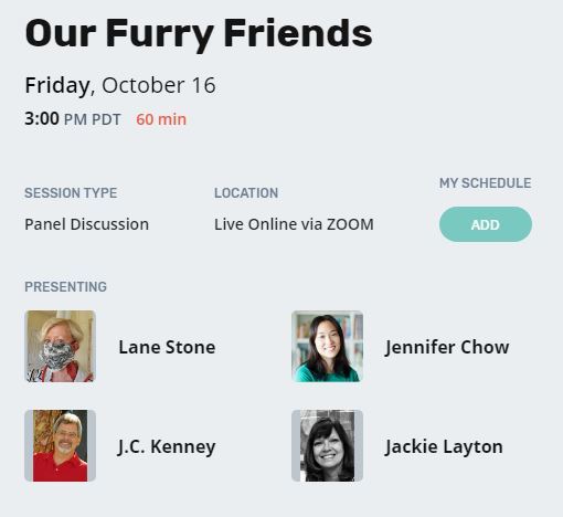Not only do I get a chance to listen to great authors, but I’m actually on a panel! I’ll be on the Our Furry Friends panel on Friday, Oct. 16th at 3pm with Lane Stone, Jackie Layton, J.C. Kenney, and Becky Muth. Kathy Krevat will be moderating. (If you’re registered for Bouchercon, please join me!)