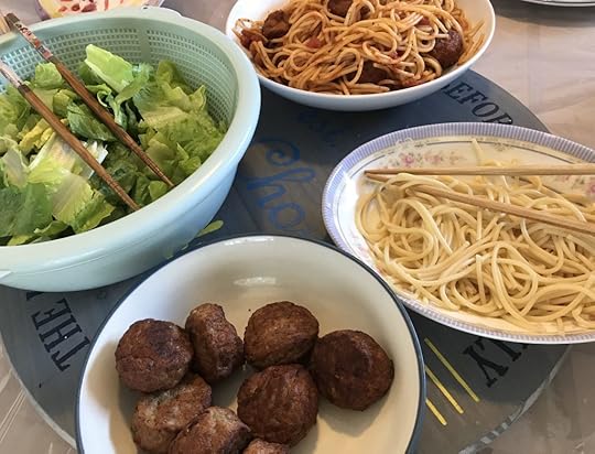 Pasta was on the menu for lunch, and I did consider changing my clothes. But since I didn’t actually have to cook it, I thought the chances of getting splattered with red sauce extremely low. (The dress made it through the meal intact.)