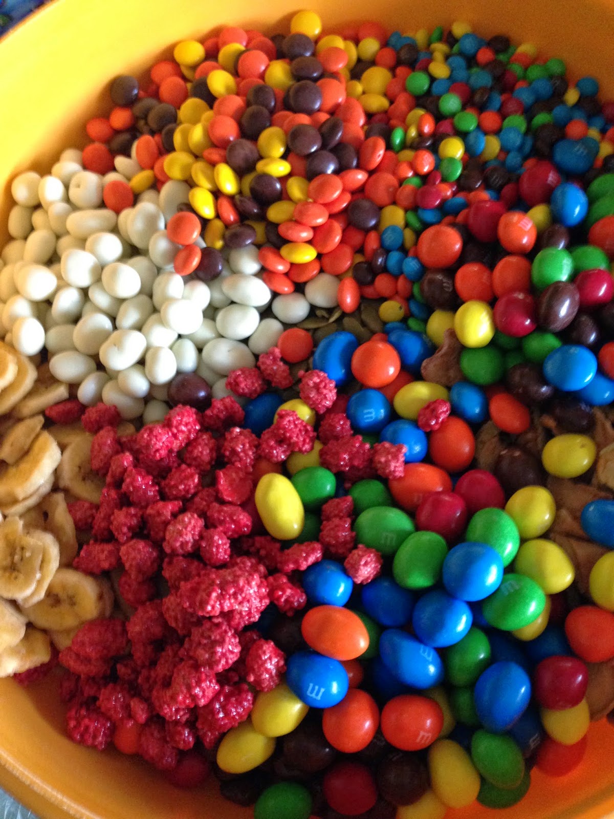 Next is where I modified it for who wants it. If you’re into really healthy eating, hide your eyes because this is where things get sweet. I put in yogurt covered stuff (raisins, nuts), several types of M&Ms (Peanut, mini-baking ones, and peanut butter), Reese pieces because the recipients are big into peanut butter, a type of Boston Baked Bean candy, dark chocolate covered raisins and almonds, and a handful of spelt sticks.