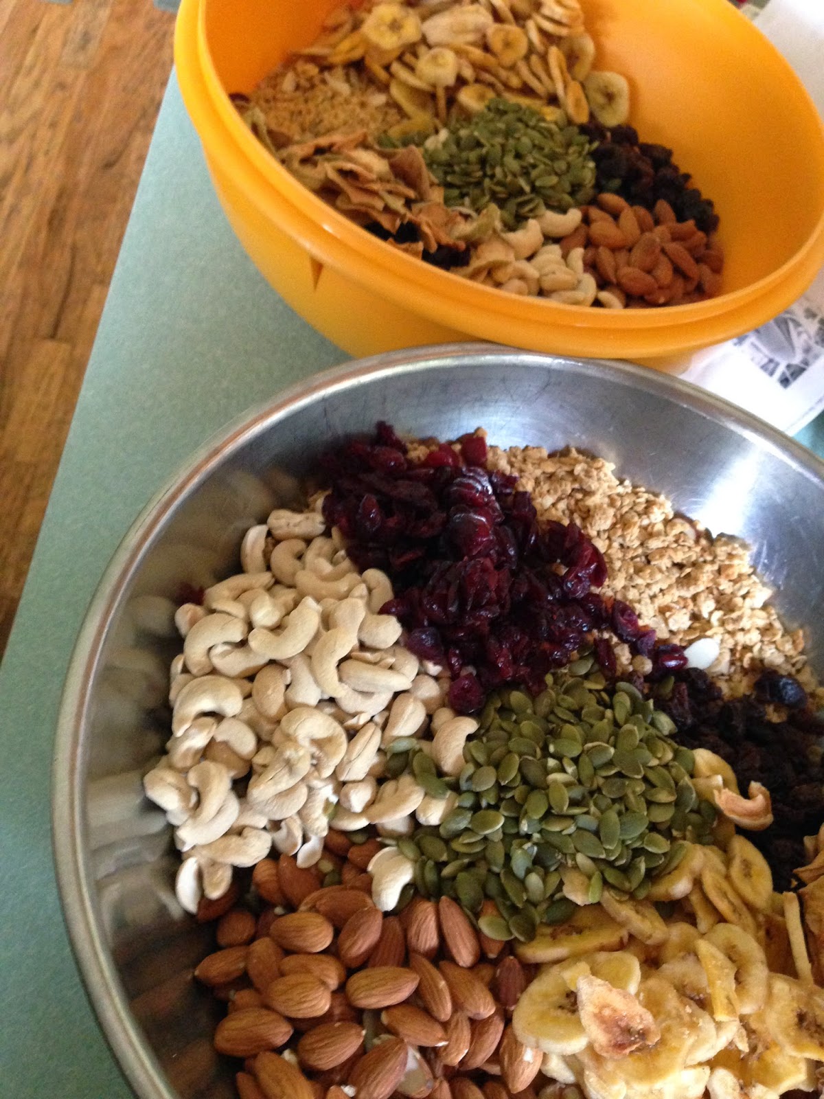 I had to use two giant bowls because I was making a huge batch. If I was making this for myself, I’d add some organic coconut, cocoa nibs, and probably dark chocolate almonds and stop here.