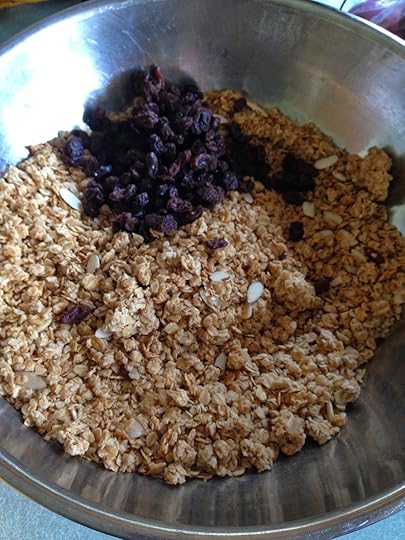 This particular batch of gorp took four boxes of almond granola. Since it didn’t have raisins, I added those.