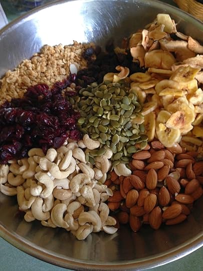 Everything I added to the next step of the process was organic and raw if possible: sunflower seeds, almonds, cashews, dried cranberries, dehydrated green apples, and banana chips. The banana chips weren’t unsweetened for this batch, because my guys don’t like them. It looked like this, nutritious and fairly healthy.