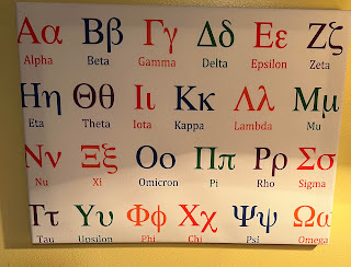 Last year I downloaded the Duolingo app onto my phone. You have to learn to read the language you study on Duolingo. I'd taught myself the Greek Alphabet. It's a whole new alphabet. You know, alpha, beta, gamma, delta, epsilon, zeta, eta, theta, iota, kappa, lamda, mu, nu, xi, OMICRON... We all know that one. There are twenty-four letters, capitals and lowercase. I vaguely remembered some of them from my days in engineering. Though I've never really learned another language, I know shorthand, so sounds in a different format isn't an entirely foreign concept. Plus I've been stuffing Greek words forcibly into my brain with Pimsleur for years.