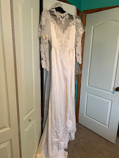 This is how it went downOver the past almost forty-years I've been dragging that giant box around the country. In Boston it took up half my closet. I never looked at it other than to shove it into a moving truck. After a couple moves in Texas, and a couple kids, I did allow my preschoolers to look through the viewing window. The dress had turned yellowish. That was highly annoying because I'd been allowing it to take up air-conditioned space in closets.