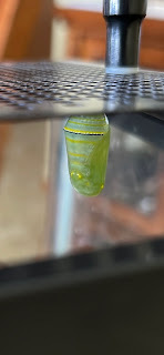 It still thrills me to watch a butterfly hatch. There is a general timeline for how long it takes an egg to hatch, the caterpillar to eat a lot of milkweed and grow into a big caterpillar, attach to the roof of a cage/stem of milkweed/bottom of the dining room table when they escape, shed their exoskeleton and form a chrysalis (not a cocoon, that's something else), and eventually become a butterfly. When they hatch it takes time for their wings to expand, they're wet and touching them will ruin them until they've dried and their wings are firm.
