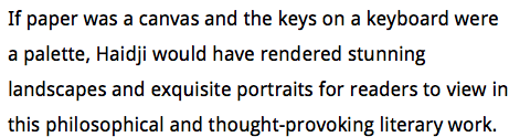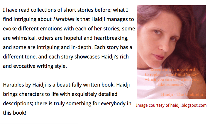 With her flair for philosophy and wonderfully descriptive details, Haidji createsstunning and thought-provoking stories that capture readers' attention. While each story has one obvious moral, readers who take the time to read between thelines and reflect upon the stories will discover that these stories offer more than than onelesson.
