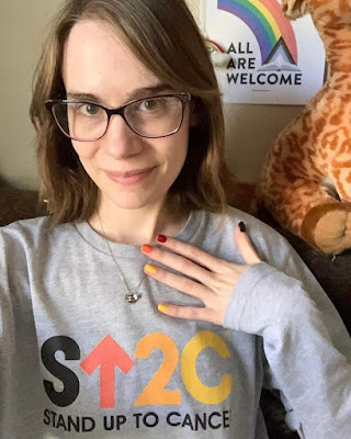 This is me with no makeup, no styled hair.Just my SU2C shirt and matching nail polishafter coming home from my mom's final chemo treatment.I will also wear it when she has her last radiation treatment, when she has a CT scan to check on the progress, and when she sees her doctor to hear the results and hopefully move on to the next phase of her treatment, which is immunotherapy.