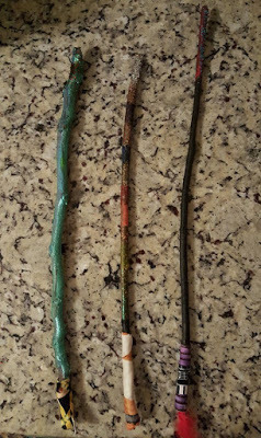 My youngest nephew's wand is the blue one. Mine is in the middle.And the black one with the feather is my oldest nephew's wand.