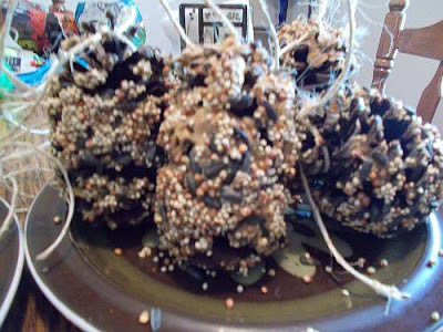 Need:Pine Cones Peanut butterBird seedPaper platesPlastic knivesStringScissors