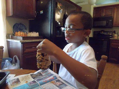 My youngest nephew was very focused.5. Once all the pine cones are coated, pour an inch or so of bird seed in a paper plate and have the kids roll their pine cones over it until all the peanut butter is hidden by seeds.