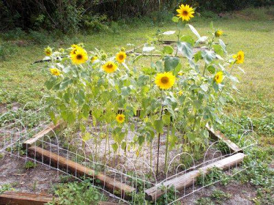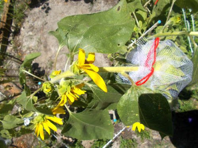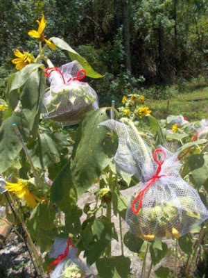 Sunflowers aren't tall blooms for long. When they start growing seeds, their heads droop, their petals fall off, and their leaves turn brown. They look pathetic, but it's what they do. I tied them to dowels to keep them upright and put a mesh around the heads to keep critters from stealing the seeds.