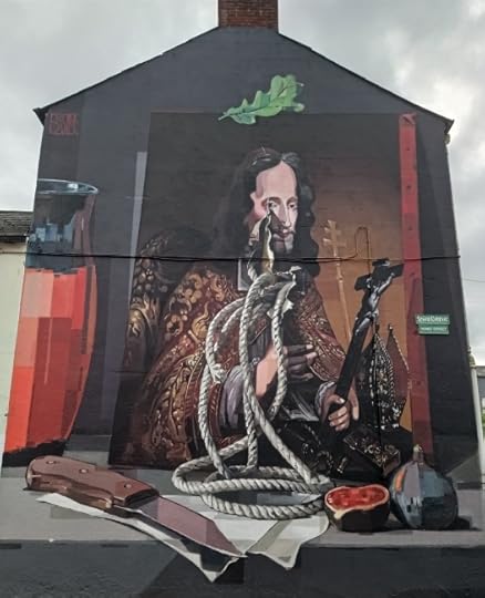 This first mural is by Italian artist Basik, whose style mixes his graffiti background with a graphic approach to painting, which is inspired by Medieval and Renaissance art. His work also looks at distinctive traits in popular culture and antique religious imagery. Basik was selected to depict Oliver Plunkett (1625-1681) who was the Roman Catholic Archbishop of Armagh and Primate of All Ireland. In spite of religious persecution from the English Crown he continued his duties and was arrested on the charge of treason. At first, he was imprisoned in cells underground in Dundalk, near where this mural has been painted, before being transported to London, where his trial took place. Oliver Plunkett was hanged, drawn and quartered at Tyburn in July, 1681.