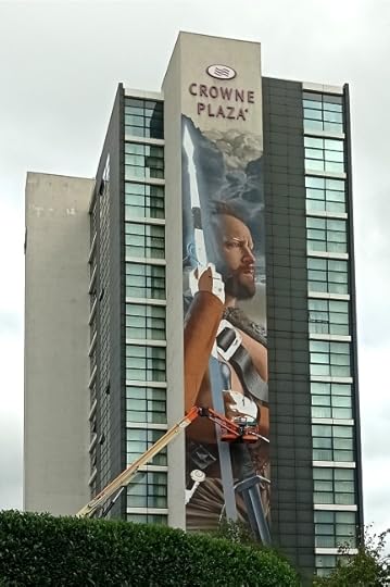 This last mural is by an Australian artist, Sam Bates aka Smug, who is based in Glasgow. It took him ten days to paint the the 41 metre high depiction of the warrior god Lugh (Lu) using 247 cans of spray paint and 180 litres of emulsion. You can see the gleaming spear in his hand but behind that hedge there is an Irish wolfhound at his feet. It graces the Crowne Plaza Hotel and is apparantly the tallest mural in Ireland.