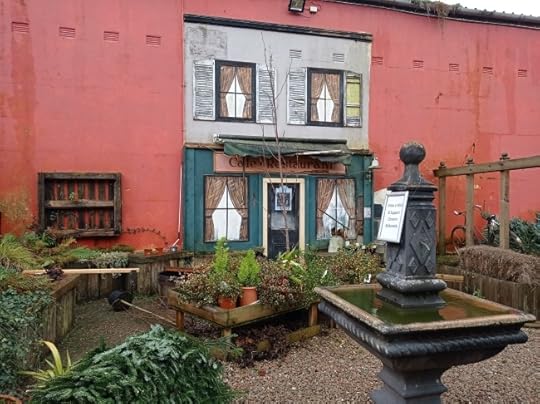 This month’s Thursday Doors features some more street art but this time from Ballycastle, County Antrim with some Irish mythology thrown in. Many towns in Ireland are now commissioning artists to brighten up their localities with murals depicting their history and culture. Some are epic pieces that fill the gable of a two or three story house and others are more subtle and blend in with their surroundings. I loved this first one at the Coffee Loft, where we had a delicious lunch. It’s set in a small garden centre in the middle of the town and the painted doors and windows really add that cosy, cottagey feel to the place.
