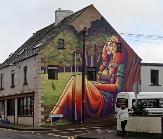 I’m pretty sure this mural depicts Sadhbh, the wife of Fionn MaCumhaill who is associated with the Giant’s Causeway not far from Ballycastle. The oak leaf possibly refers to the oak tree being a Celtic symbol for strength. Because Sadhbh refused to marry a druid he put a spell on her and she changed into a young doe and remained like that for over three years. One of the druid’s men felt sorry for her and said if she entered the home of one of the Fianna (a fearsome warrior band in Irish mythology) the spell would be broken.