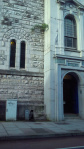 I like the Art Deco design on the pillars. The next image has pillars, too, which made it a bit of a challenge to get a clear view of a door – especially as this was a ‘drive-by’ shot from the car. It’s the entrance to St. Mary’s Church on Pope’s Quay (very appropriate address for a Roman Catholic church). The building dates back to 1832. If you look closely, you’ll see a man’s face on one of those doors. I have no idea who he is or why he’s been put there.