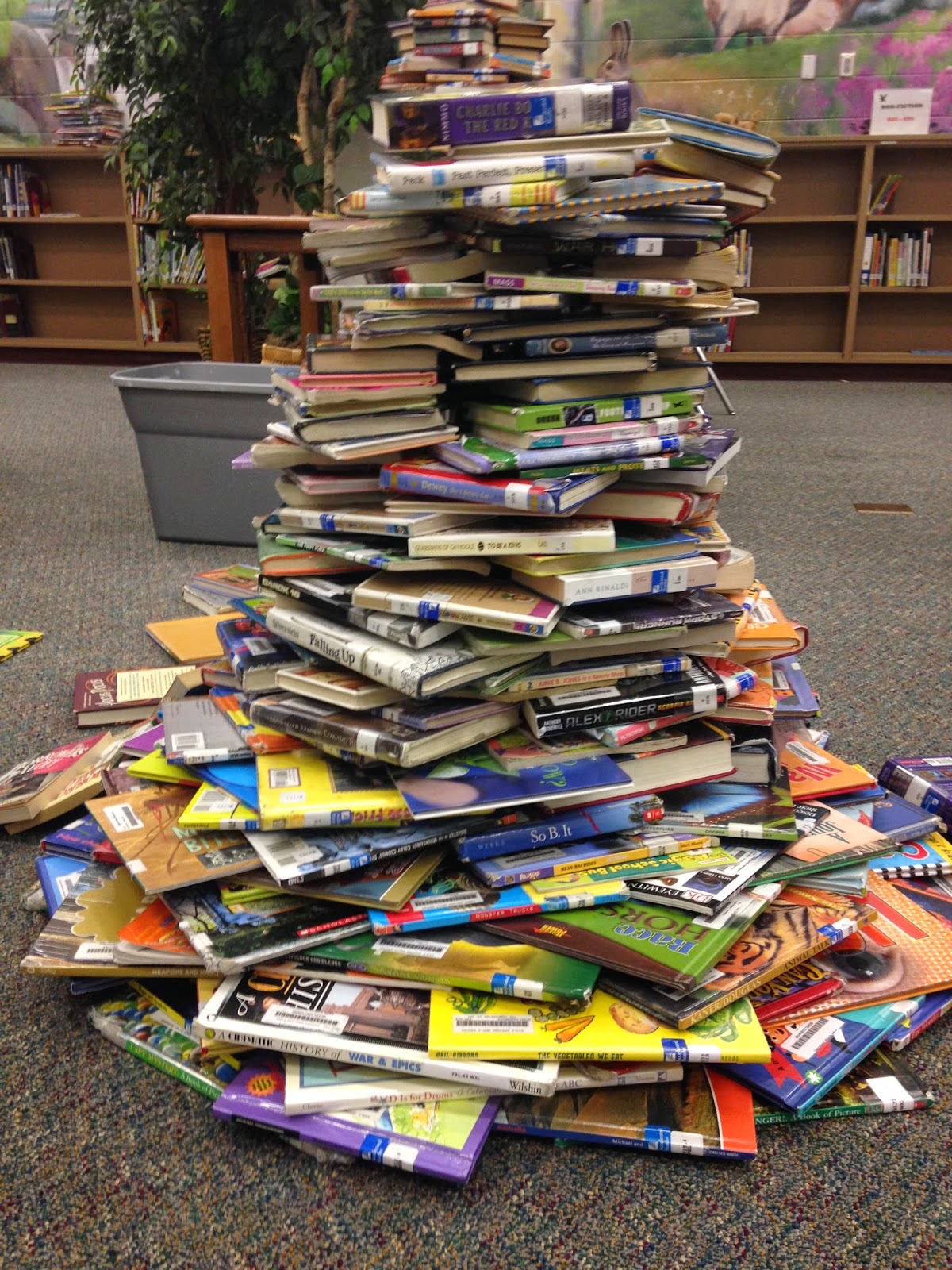 I confess that I laughed as some of my students made a tree for me. I tried to talk to them about making things level, but they kept piling books half-hazardly. It looked great. For 30 minutes. They left, and it completely fell. a volcano eruption.