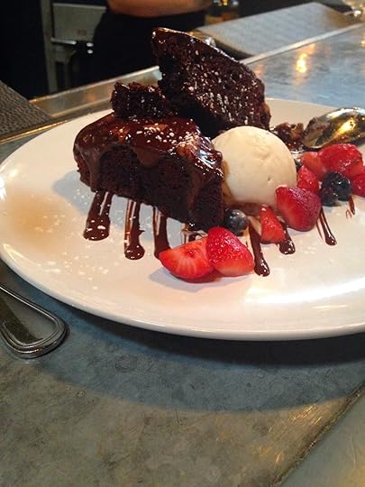 I confess that I ate the BEST chocolate cake I have ever eaten at Benjy's in Rice Village Thursday night. (It's a beautiful part of Houston around Rice University.) It's got a great atmosphere with an upstairs lounge/patio.It definitely canceled out any benefits of that smoothie.