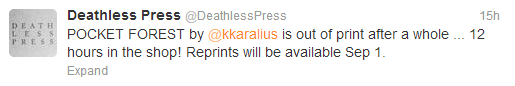 Deathless Press had published my chapbook, Pocket Forest,back in August. The first edition sold out within 12 hours. The second and thi...