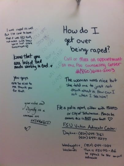 I went to the bathroom in a building on my campus and saw this on the back of the stall door. While I’m deeply upset that a young woman went through such a horrible ordeal, I’m also very touched that so many other girls wanted to help her and offered advice as well as ways to seek help. We are women hear us roar.