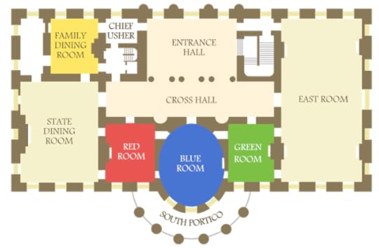 There are good reasons why George Washington preferred an oval shape for his main reception room, as we shall see. Although Washington never lived in the White House, he created the model for the "elliptical saloon," as the Blue Room was originally called, at the President's House in Philadelphia (1790 - 1797). Above and below the Blue Room are two more oval rooms, all three stacked something like a wedding cake, except that instead of a tiny bride and groom at the top there sits the Truman balcony looking out on the South Lawn.
