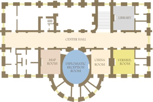 Above the Blue Room is the Yellow Oval Room, part of the second-floor residential area just mentioned. Below the Blue Room is the Diplomatic Reception Room into which Jackie Kennedy put the "Scenic America" panorama by Zuber in 1961.