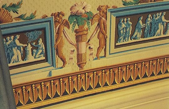 In 1972 Nixon approved the installation of a French reproduction wallpaper which would change the Blue Room walls from fabric to paper. The pattern is attributed to Jacquemart and Benard, dated to around 1800. The elaborate frieze shown here was only part of the decoration. Like many French wallpapers of the period, it had an accompanying bottom border and a sidewall with two alternating motifs (lyre and shield). All matched perfectly on the wall. That is, they were designed to match perfectly on the wall.
