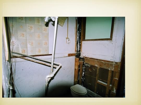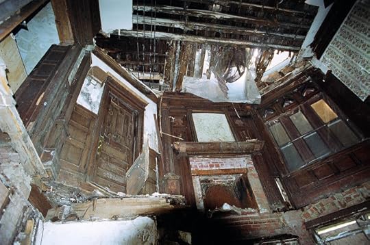 3. Ventfort Hall in disarray: the view from the basement looking up through the collapsed floor to the dining room.Six seemingly first-generation wallpapers from the house are of prime importance: a leather paper, a block printed floral, a “stenciled look,” a Lincrusta-type, an Anaglypta-type, and a varnished tile.