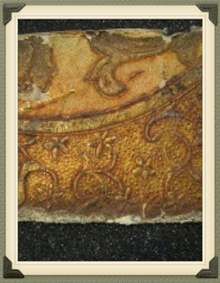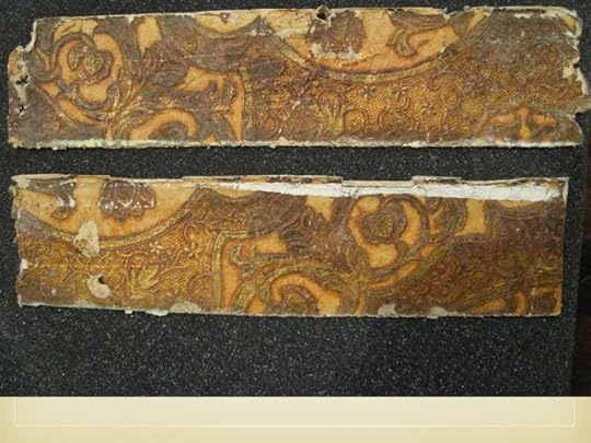 6. "leather" paper in Long HallThe first samples to consider are the so-called leather papers. These oblong scraps were found beneath the cornice moldings in the first-floor hallway. Leather papers were highly processed. They were created by embossing and finishing paper laminates to approximate the effect of gilt leather. There seems to have been a shift from multiple layers to single layers as machine embossing improved. Leather papers were often promoted in the pages of The Decorator and Furnisher. During a review of the offerings of Warren, Fuller & Company, a writer stated: "We must not forget to mention the leather papers. The most striking one is the Heraldic shield pattern. Unusual care has been taken in producing this high relief effect. These are well named, as they retain the character color and texture of stamped leather. Architects and others will be gratified in finding so close a resemblance."[2] This direct appeal to architects is telling, for it would have been Arthur Rotch or George Tilden who chose, or, have had a hand in choosing, the interior finishes. Both were trained for this creative role at the Beaux Arts school in Paris.