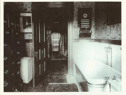 7. block printed floral in 1894This block printed floral was found in a bathroom thought to be Sarah's. Even though the design and colors are elaborate, the wallpaper conforms to English reform design principles. The flowers are not naturalistic but instead symmetrical, two-dimensional flowers. The strange object on the bathroom wall was apparently part of the burglar alarm system.