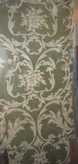 9. "stenciled look"The next pattern has been dubbed a “stenciled look.” The two colors are simply rendered in a post-medieval style, but the vertical repeat is very long—55". This wallpaper was almost certainly created with block prints, and therefore expensive. This looming pattern decorated the wide third-floor hallways outside of the guest rooms. Incidentally, the pattern as rendered here is askew, due to the preserved strip of wallpaper twisting in mid-air.