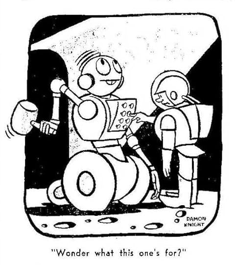 When you think of Damon Knight (1922-2002) you get a picture in your head of an old dude with a long, grey beard. Maybe you see him editing Orbit or hanging off the arm of his wife, Kate Wilhelm. Knight won many awards, wrote several books on writing science fiction, and is best remembered as a reviewer with high standards of quality in the genre. What you don’t picture is a twenty-year-old kid doodling – because Damon Knight started in science fiction as an artist. His first published work was in Amazing Stories, May 1940. His first story appeared just a little later in Ray Bradbury’s fanzine, Future Fantasia, Summer 1940. It was called “The Itching Hour.” His first professional sale wasn’t until February 1941 in Stirring Science Stories with “Resilience,” where they botched the ending. By 1950 he would be writing stories like “Not With a Bang” and “To Serve Man” (made famous on The Twilight Zone with “It’s a cookbook!”) and his fame as a short story writer would be forever set. Before then, a lot of minor work and plenty of artwork.