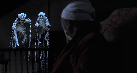 When the song is done, it's interesting that the Marleys have to be literally dragged back towards the bannister by their own chains. They struggle to get out the last of the message, but manage to tell Scrooge about the coming spirits. They're vague about the timing though and only mention that the first is coming that night at 1:00.