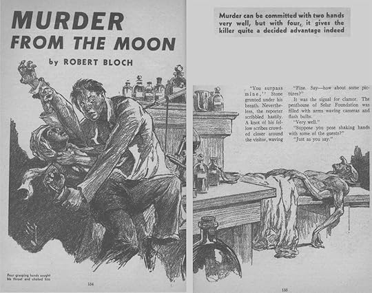 Isaac Asimov’s complaint was that science fiction mysteries did not play fair. And I think Robert Bloch’s story should be included amongst these types of stories. If we knew all the facts about Lunarians, we would have figured out the killer pretty quick. In an Asimovian SF mystery, we would know all about the Lunarians, their physiology and such, and still would not know who the killer was. Bloch has not done this, though I don’t think he particularly cared in this case. He wasn’t writing for Ellery Queen Mystery Magazine, but for Ray Palmer’s Amazing Stories. Bloch certainly was able to follow the rules as he did in novels like The Scarf (1947) and in the 1950s and 1960s stories for EQMM.