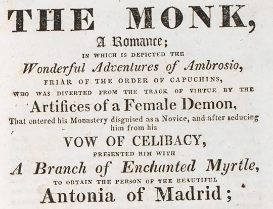 The innovation that Lewis brought to the genre was luridness. It had been relatively chaste up to that point, with horrors mostly being threatened or suggested. Lewis' titular character doesn't just threaten and menace an innocent young woman; he does terrible things to her. And to other characters in order to get to her. And the novel spends a great deal of time chronicling the monk Ambrosio's fall into depravity. He's already not a nice guy as the novel opens - he's proud and he lusts after the Virgin Mary, to start with - and he sinks deeper from there, encouraged by supernatural forces.