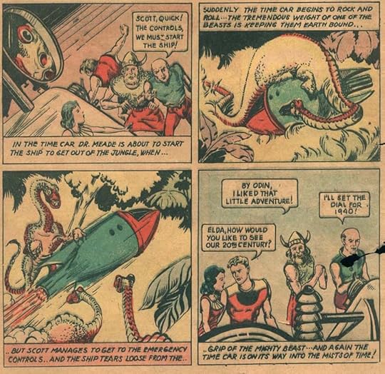 True to the Flash Gordon formula (which had been around since 1934; earlier if you consider that it stole its inspiration from 1929's Buck Rogers), the team of adventurers in "Scott Rand" has an older, bald, cerebral leader in Dr. Meade. Meade's inventions, such as the time-car, allow our heroes to be heroic. Contrasted to Meade is Scott Rand; young, wavy-haired, blonde, and muscular. Partnered with Thor, a Viking from the year 200 AD, the team has plenty of brawn. Finally, the last member is Princess Elda, who is beautiful and exotic and completely useless, needing to be rescued frequently and acting as cheerleader to Scott or lab assistant to Meade.