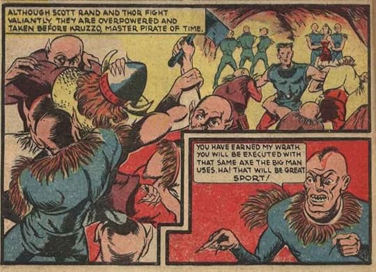 The final portion of the tale begins with Dr. Meade and Elda's being captured by Kruzzo the Ice King of Mars. Scott (whose hair is now brown for some reason), Thor, and the unnamed leader of Earth go in pursuit, taking out Kruzzo's pirate fleet near the equator of Mars. Here they learn that not all the Martians are bad, only those working for Kruzzo. The heroes fly to Mars's south pole to infiltrate Kruzzo's base. They sneak in, find the captives, then fight the Martian pirates. Dr. Meade throws a rock into the air apparatus and blows up the baddies while the good guys escape. This last portion seems weaker than the previous two, and no one cried to see the series end here.So why is "Scott Rand in the World of Time" so bad? Did it not have one of SF's hottest writers at the time? A man who would create Mary Marvel and Supergirl, writing over 50,000 pages of comics in his career? Yes, but "Scott Rand" was early in Binder's career, and written at lightning speed. The comic shops of 1940 pumped out pages at a terrific pace, with little concern for legacy. This was grunt work for low pay. Ideas were stolen, snatched from whatever was hot at the time; whatever was tried and true (though different enough you wouldn't get sued). Even later masters like Will Eisner and Jack Kirby tore through page after page, trying to keep the wolf from the door. The opportunity for greater creativity and care would have to wait until the comics industry abandoned the shop model and replaced it with the bullpens of companies like DC and Marvel. Otto and Jack Binder would make those contributions with Captain Marvel and Superman in the years to come.