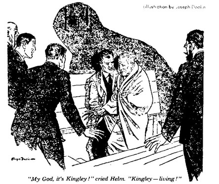 I suppose the company presenting the first shows would not want to confuse potential consumers with too wide a genre selection, so they selected one of Hamilton's stories with a more morbid angle. In the original story, we follow reporter Jerry Farley and county detective Peter Todd as they unravel the mystery of how Dr. Charles Curtlin resurrects three rich men who had been dead for six months. Todd interviews each man, asking him if he remembers being threatened by unknown parties before their deaths. Each answered that he did. The final solution to the mystery is presented at the moment Dr. Curtlin reveals his final specimen, before he will supposedly destroy the resurrection ray machine and his notes. Todd knows the whole thing is a con and proves it by admitting that none of the dead had ever been threatened at all. Curtlin is a famed plastic surgeon and created false millionaires so he could control their money. This kind of fake science fiction tale would prove more popular in magazines like The Saint with stories by Cleve Cartmill, or in the tales of Ed Hoch in Ellery Queen Mystery Magazine, though the tradition runs back to Ann Radcliffe and her explained away horrors.