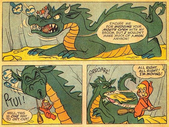 Another favored theme was the quest. These stories would appear in three parts throughout the issue. Most involved a new location in each segment, including castles, forests, and cloud realms. For example, the three episodes, "When Magic Words Fail You," "Monsters and Demons and Stuff Like That," and "The Land of White Magic" in Wendy, The Good Little Witch #89 (August 1975) begins with Wendy's evil aunts turning Danny the Dwarf into a fish. This Macguffin sends Wendy on a quest to find a cure from the Land of White Magic. Her journey takes her into a creepy cave at Mount Happiness where the Scorpion King and his Grabniks try to grab her. She flees into the Demon Hall where demons chase her into the Dragon's Lair, then the Plant People Land, the Land of the Lonesome Ogre, and finally to the Land of White Magic. There she has to work her way through the bureaucracy, but eventually sees King Goodheart, who gives her lodgings, then a cure to the spell. Wendy lays a trap for her aunts when they try to turn Danny into a fish again. This time their spell gives him a big bag of gold. This is typical Harvey quest, following a structure as old as Gilgamesh.